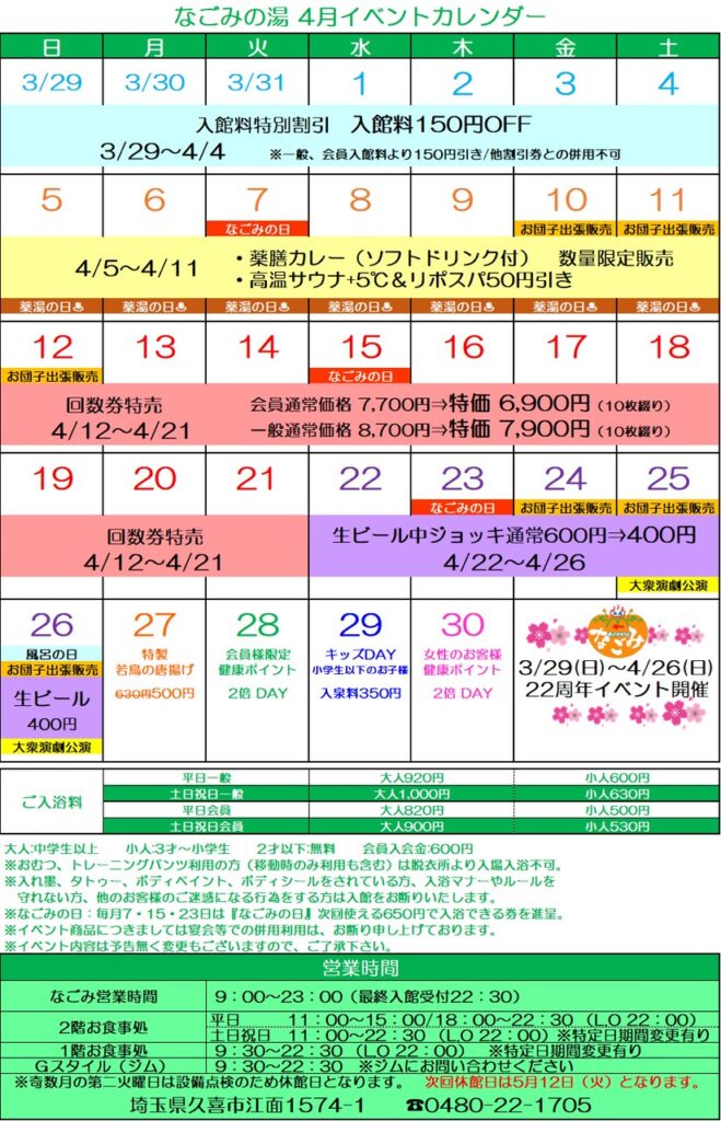 2026年4月9日(木)かすかべ湯元温泉(埼玉県春日部市)