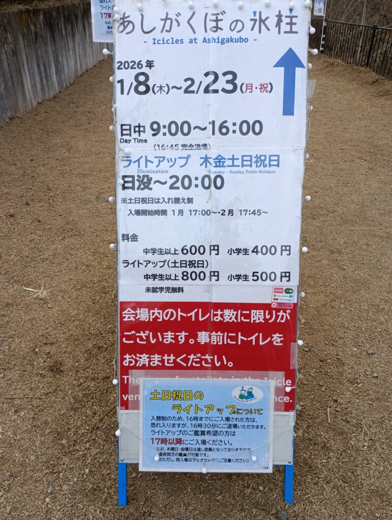あしがくぼの氷柱のライトアップは【土・日・祝日】は注意です。