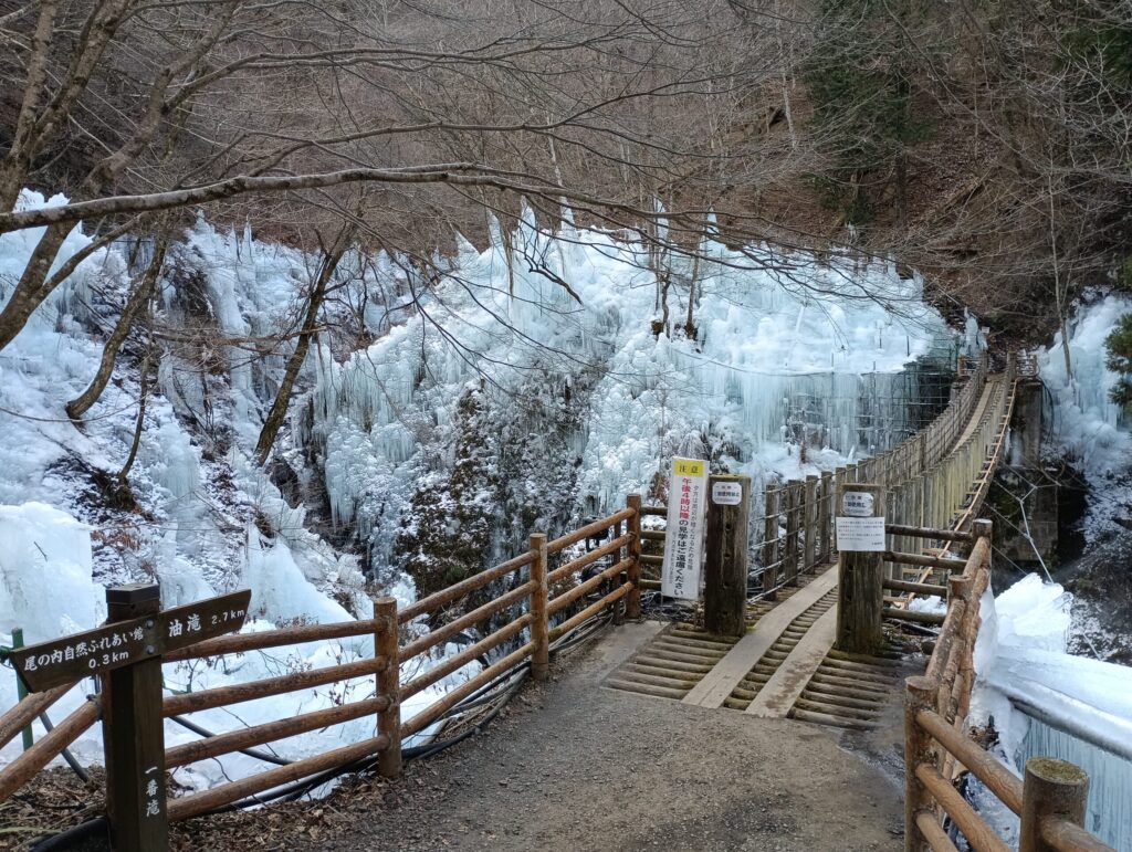 尾ノ内氷柱の魅力は吊り橋から眺める氷柱景観です。