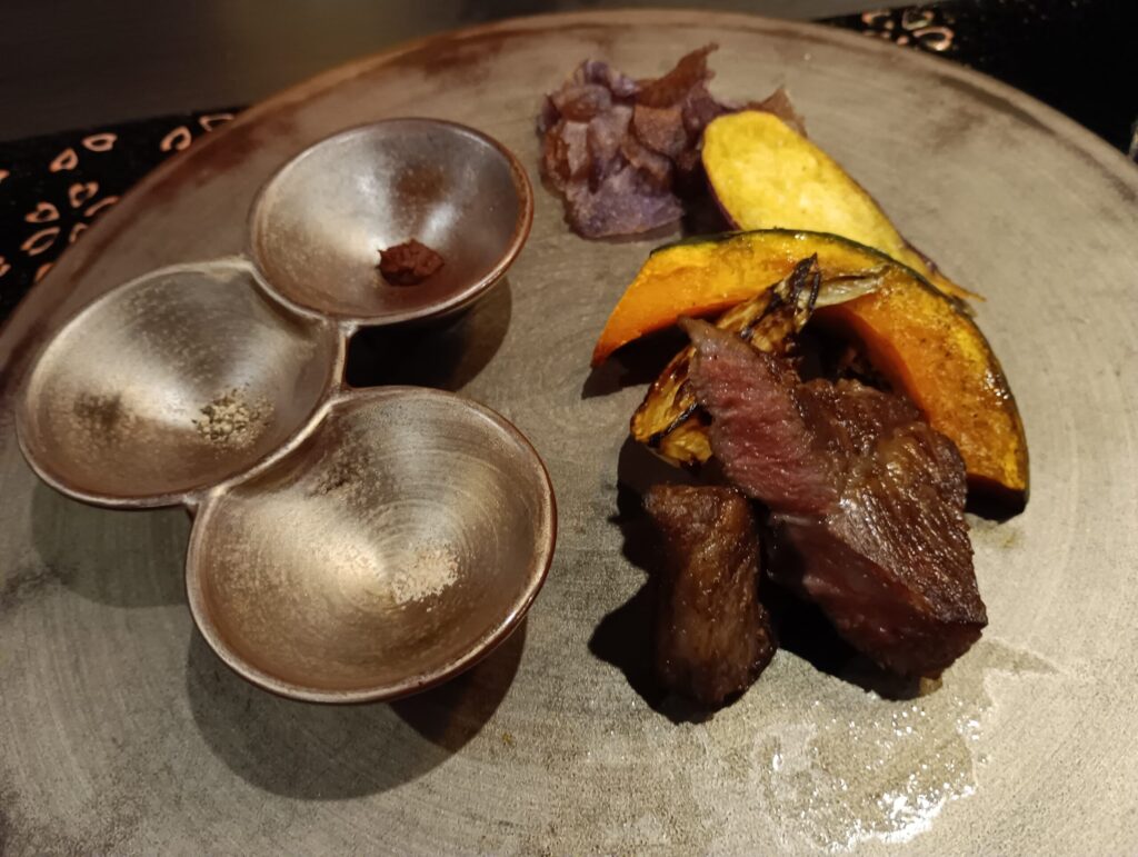 - 国産牛サーロインの低温調理 秋野菜と三種の薬味を添えて