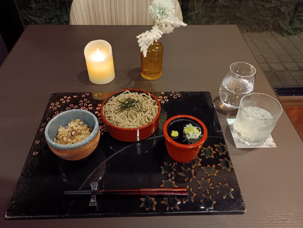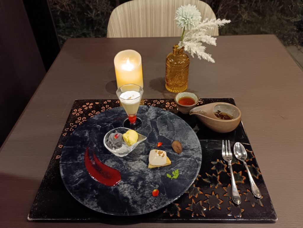 夜景と荒川の川の音を感じながら食後のひとときを過ごすことができました。